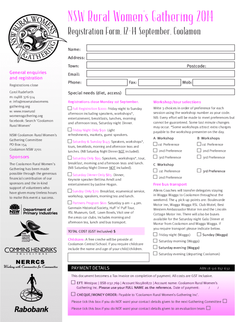 Get the free Nsw Rural Women’s Gathering 2014 Registration Form