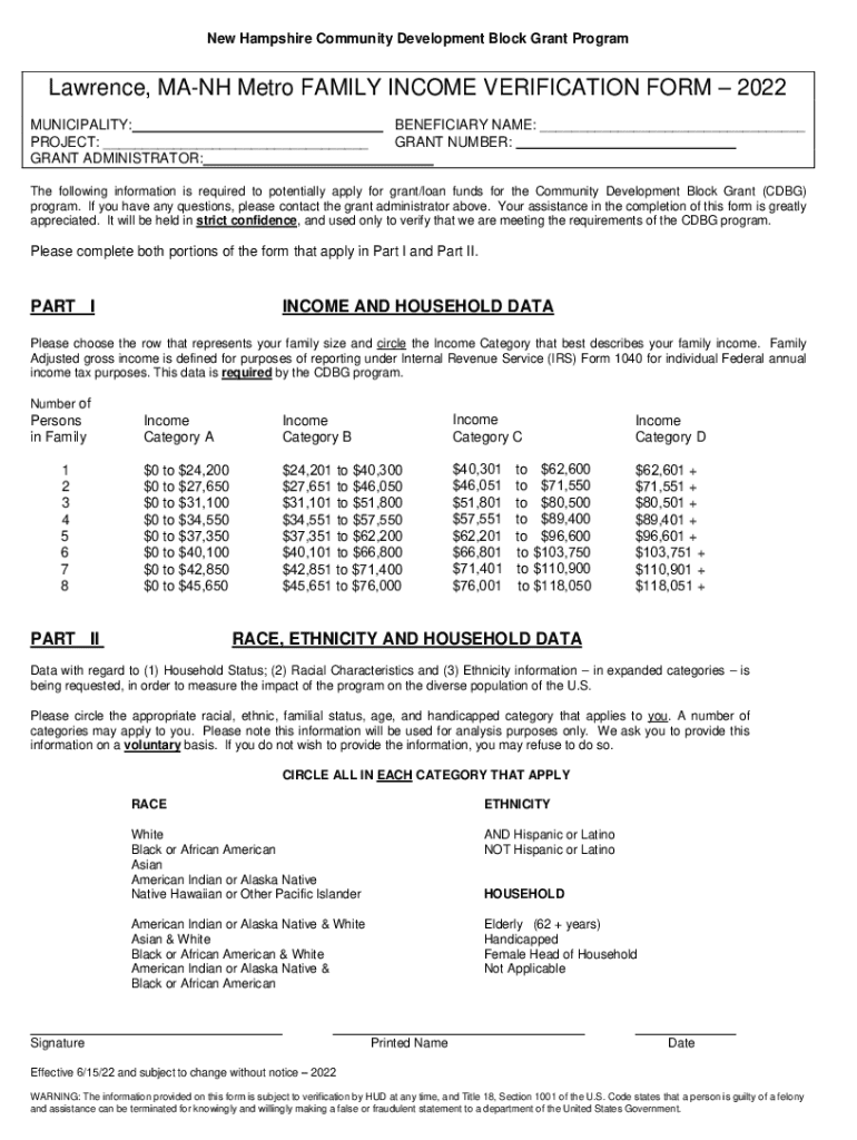 New Hampshire Community Development Block Grant ProgramLawrence, MANH Metro FAMILY INCOME VERIFICATION FORM 2022 MUNICIPALITY: PROJECT: ___ GRANT ADMINISTRATOR:BENEFICIARY NAME: ___ GRANT NUMBER:The