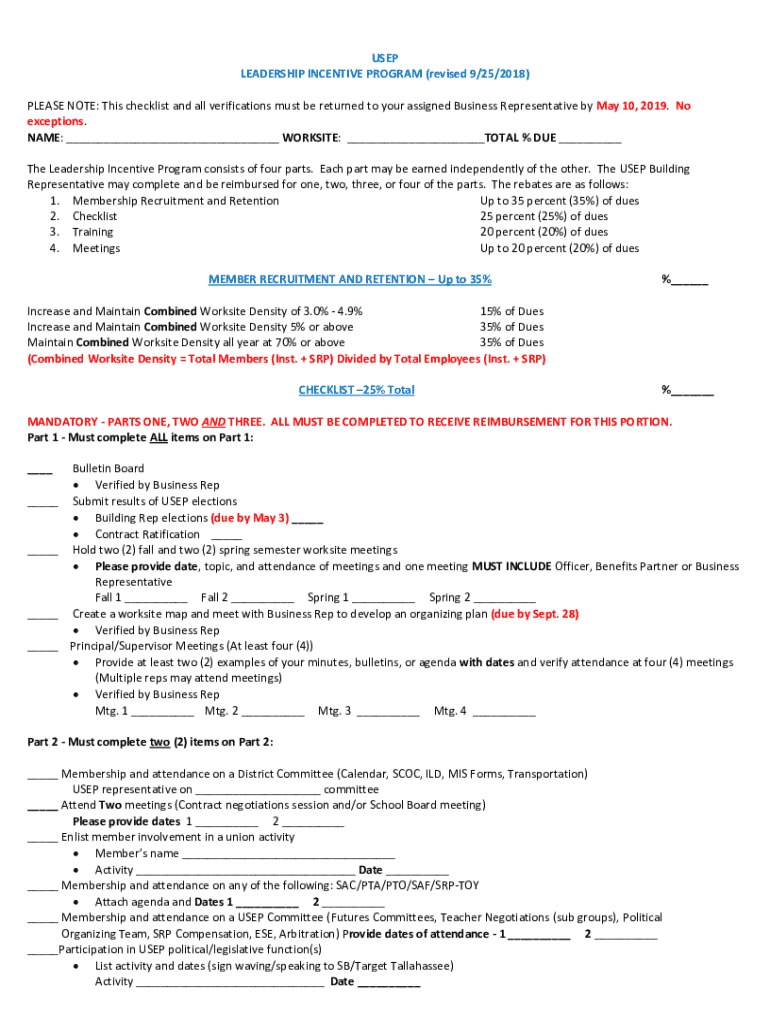 USEP LEADERSHIP INCENTIVE PROGRAM (revised 9/25/2018) PLEASE NOTE: This checklist and all verifications must be returned to your assigned Business Representative by May 10, 2019. No exceptions. NAME: