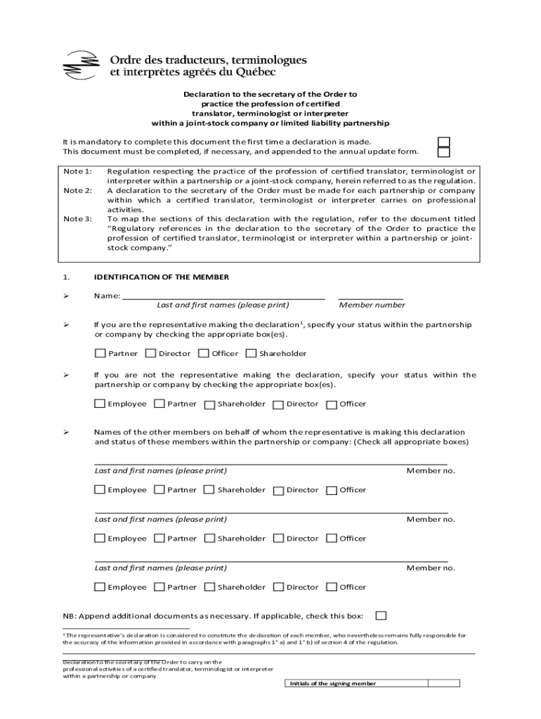 Declaration to the secretary of the Order to practice the profession of certified translator, terminologist or interpreter within a jointstock company or limited liability partnership It is mandatory