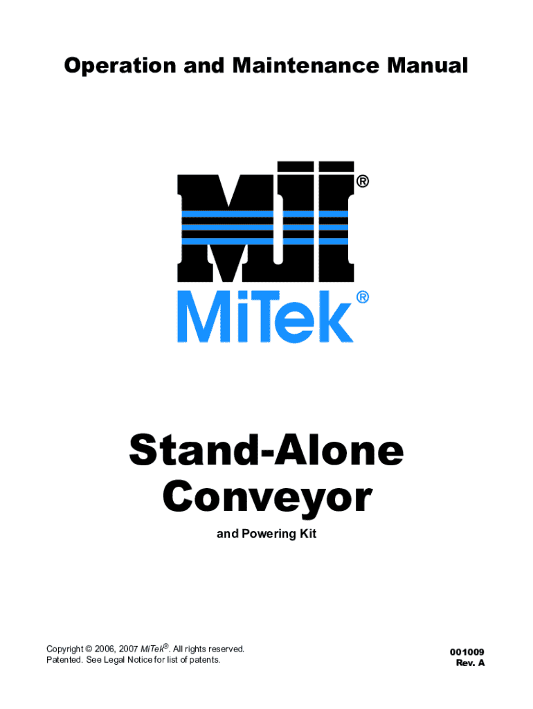 Operation and Maintenance ManualStandAlone Conveyor and Powering KitCopyright 2006, 2007 MiTek. All rights reserved. Patented. See Legal Notice for list of patents.001009 Rev. AOperation and Maintenance