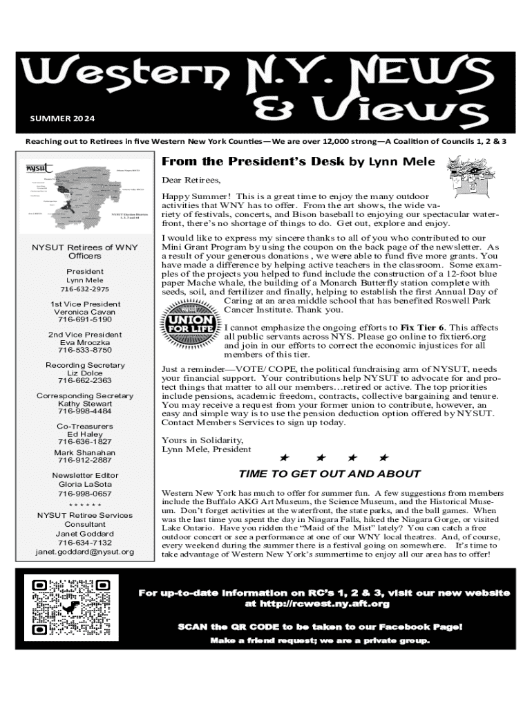 SUMMER 2024 Reaching out to Retirees in five Western New York Counties are over 12,000 strong Coalition of Councils 1, 2 & 3From the Presidents Desk by Lynn Male Dear Retirees, Happy Summer! This