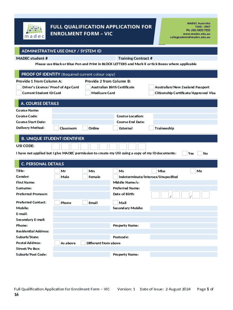 Key Features of the Full Qualification Application for Enrolment Form – VIC