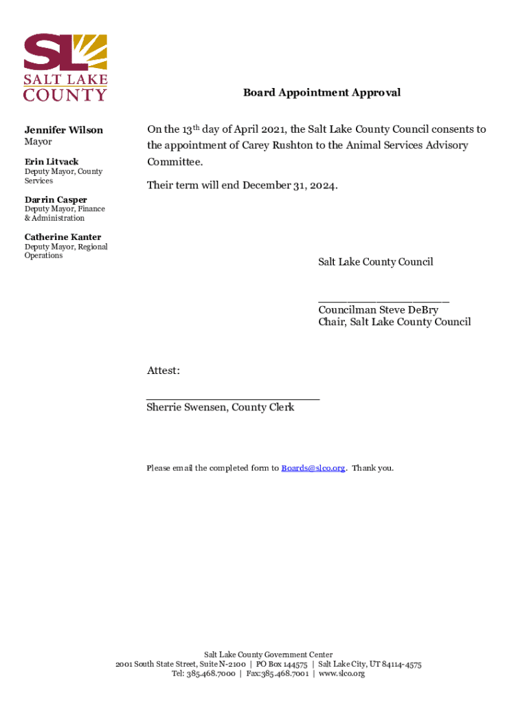 Official document approving Carey Rushton for the Animal Services Advisory Committee by the Salt Lake County Council, effective until December 31, 2024.