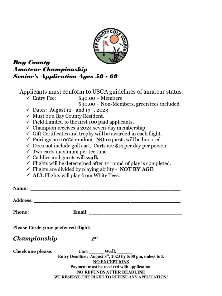 Bay County Amateur Championship Seniors Application Ages 50 69 Applicants must conform to USGA guidelines of amateur status. Entry Fee: $40.00 Members $90.00 NonMembers, green fees included th Dates: