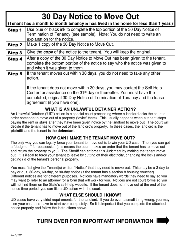 30 Day Notice to Move Out (Tenant has a month to month tenancy & has lived in the home for less than 1 year.) Step 1 Use blue or black ink to complete the top portion of the 30 Day Notice of Termination