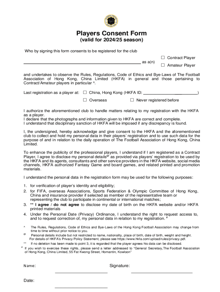 Players Consent Form (valid for 2024/25 season) Who by signing this form consents to be registered for the club Contract Player as a(n)Amateur Player and undertakes to observe the Rules, Regulations,