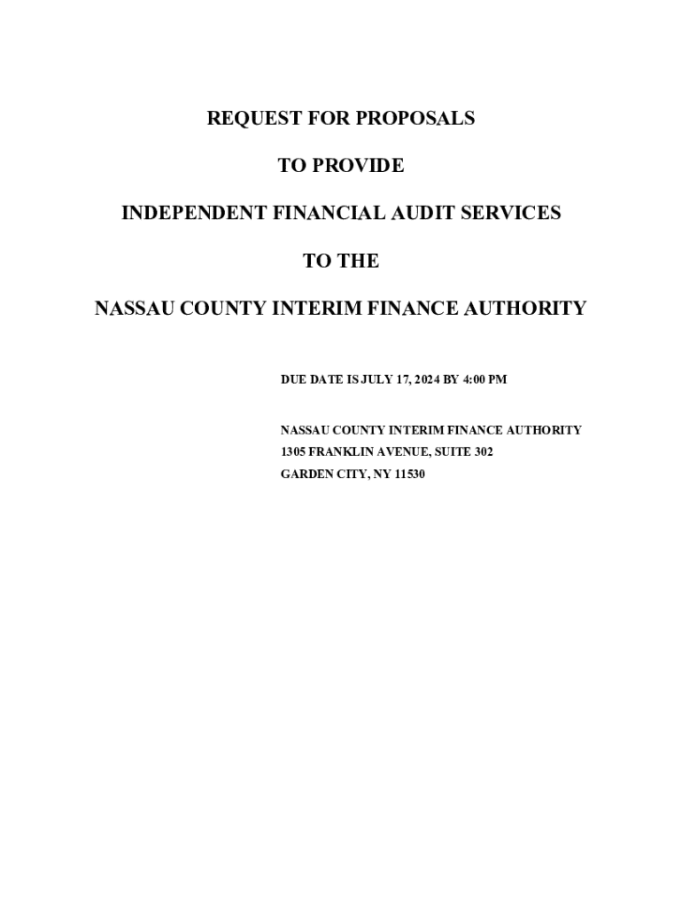 REQUEST FOR PROPOSALS TO PROVIDE INDEPENDENT FINANCIAL AUDIT SERVICES TO THE NASSAU COUNTY INTERIM FINANCE AUTHORITY DUE DATE IS JULY 17, 2024 BY 4:00 PMNASSAU COUNTY INTERIM FINANCE AUTHORITY 1305