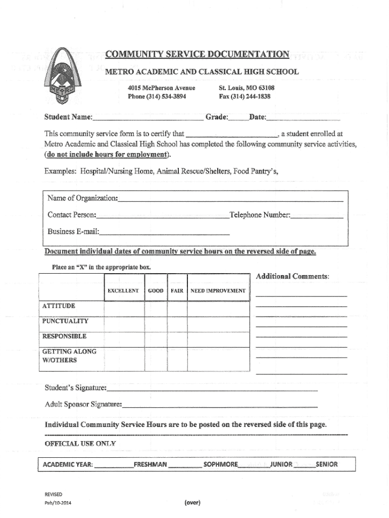 This document certifies community service hours for students at Metro Academic and Classical High School in St. Louis, ensuring engagement in valuable community activities.