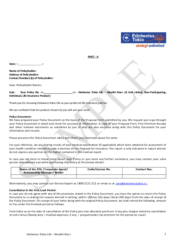 PART A Date: ___ Name of Policyholder: Address of Policyholder: Contact Number/(s) of Policyholder: Dear Policyholder Name, Sub.: Your Policy No. ___ Edelweiss Tokyo Life Wealth Rise+ (A Unit Linked,