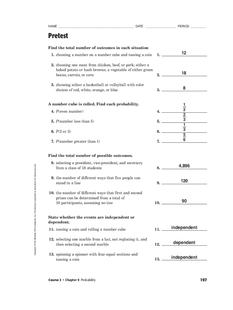 193_204_CC_A_AMC2_C09_662328.Indy Page 197 26/06/11 4:36 AM s60userVolumes/110/GO00864/NATIONAL/COMMON_CORE_QUICK_CHECK_COURSE1NAME ___ DATE ___ PERIOD ___Pretest Find the total number of outcomes