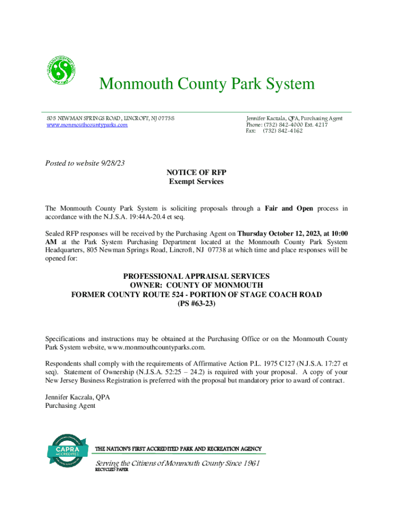 Monmouth County Park System 805 NEWMAN SPRINGS ROAD, LINCROFT, NJ 07738 www.monmouthcountyparks.comJennifer Kaczala, QPA, Purchasing Agent Phone: (732) 8424000 Ext. 4217 Fax: (732) 8424162Posted to