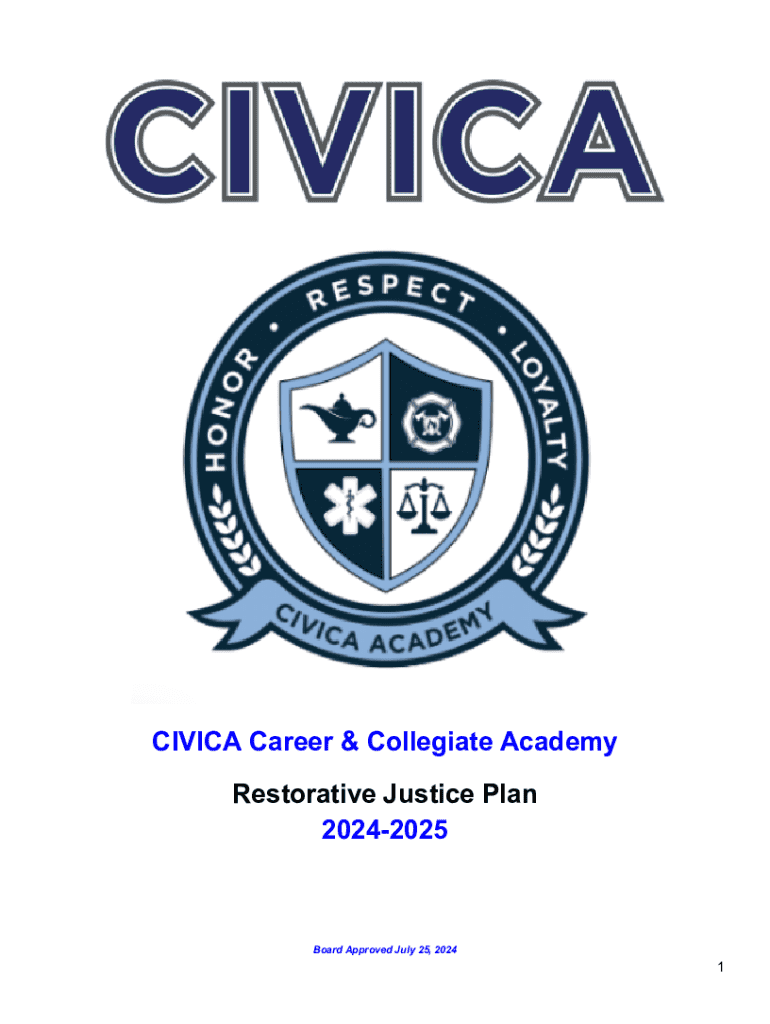 Explore CIVICA Academy\'s Restorative Justice Plan for 2024-2025, emphasizing a supportive environment and progressive discipline to foster student success.