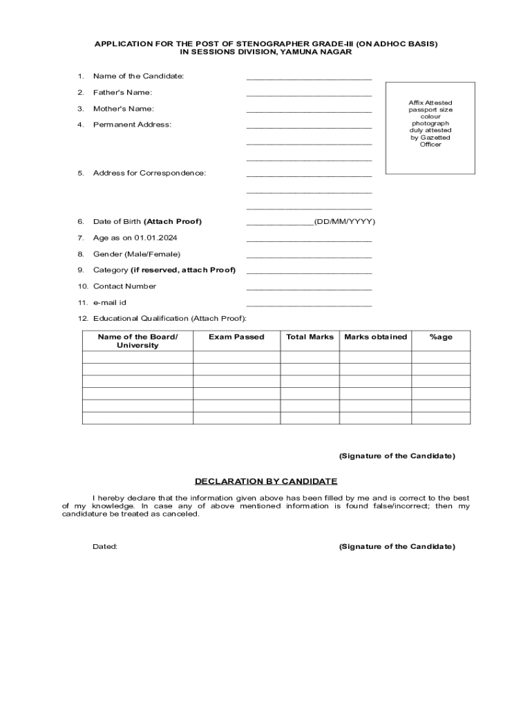 Apply now for the Stenographer Grade-III position in Yamuna Nagar. Fill out your details and ensure your application is submitted correctly for 2024.