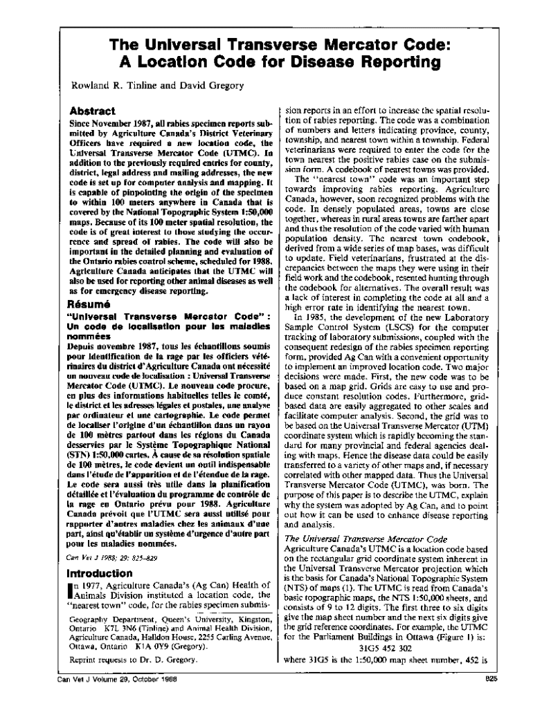 The Universal Transverse Mercator Code: A Location Code for Disease Reporting Rowland R. Tinline and David GregoryAbstract Since November 1987, all rabies specimen reports submitted by Agriculture