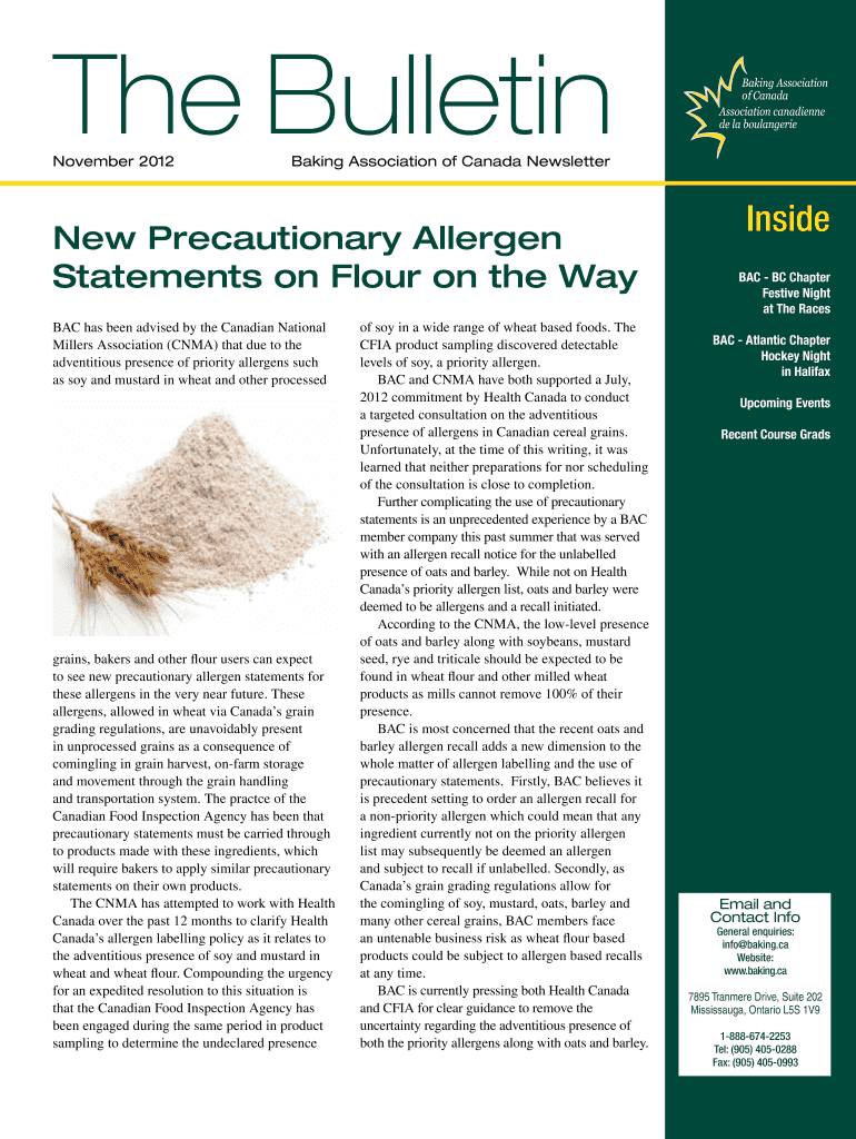 November 2012 Baking Association of Canada Newsletter New Precautionary Allergen Statements on Flour on the Way BAC has been advised by the Canadian National Millers Association (COMA) that due to