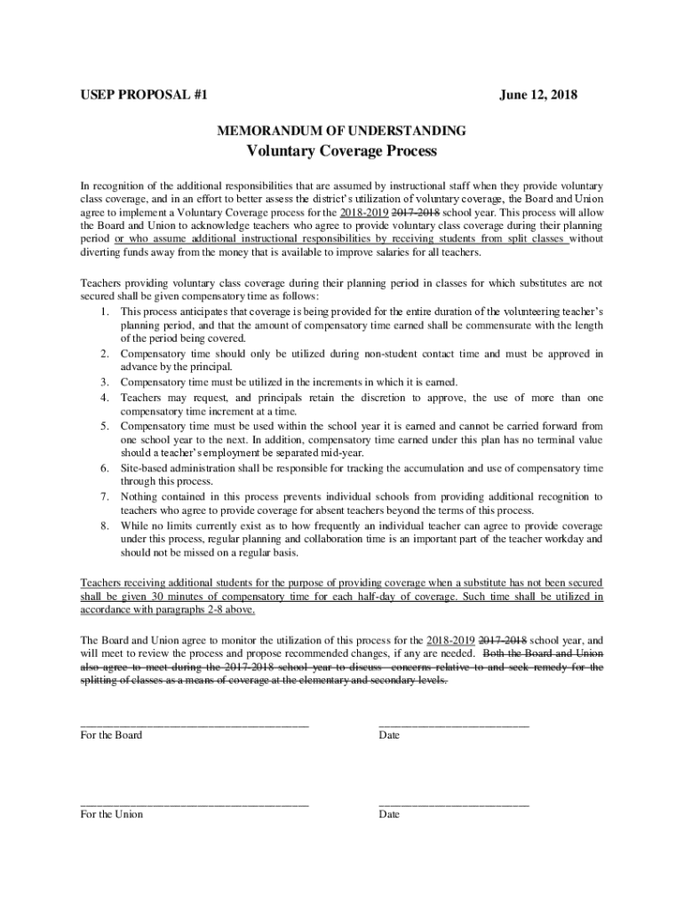 USEP PROPOSAL #1June 12, 2018 MEMORANDUM OF UNDERSTANDINGVoluntary Coverage Process In recognition of the additional responsibilities that are assumed by instructional staff when they provide voluntary