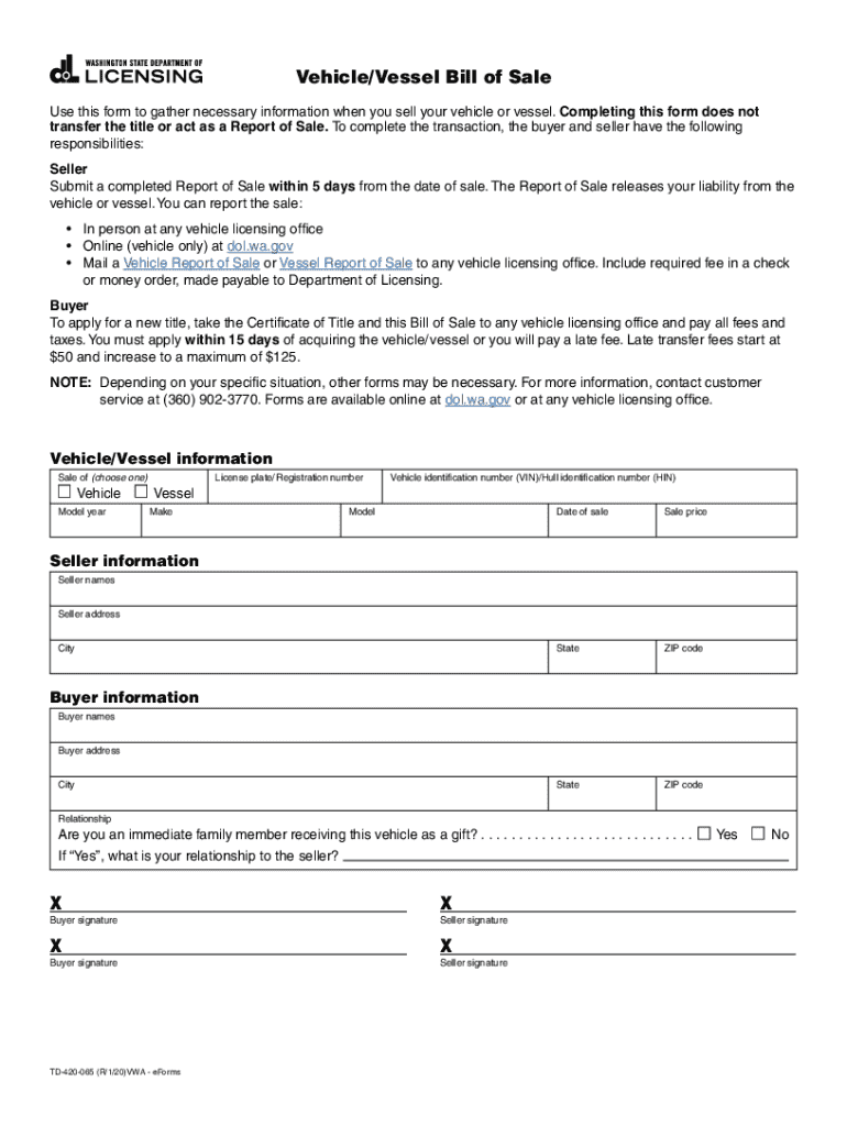 Get the free Washington State Vehicle or Boat Bill of Sale Form TD-420-065