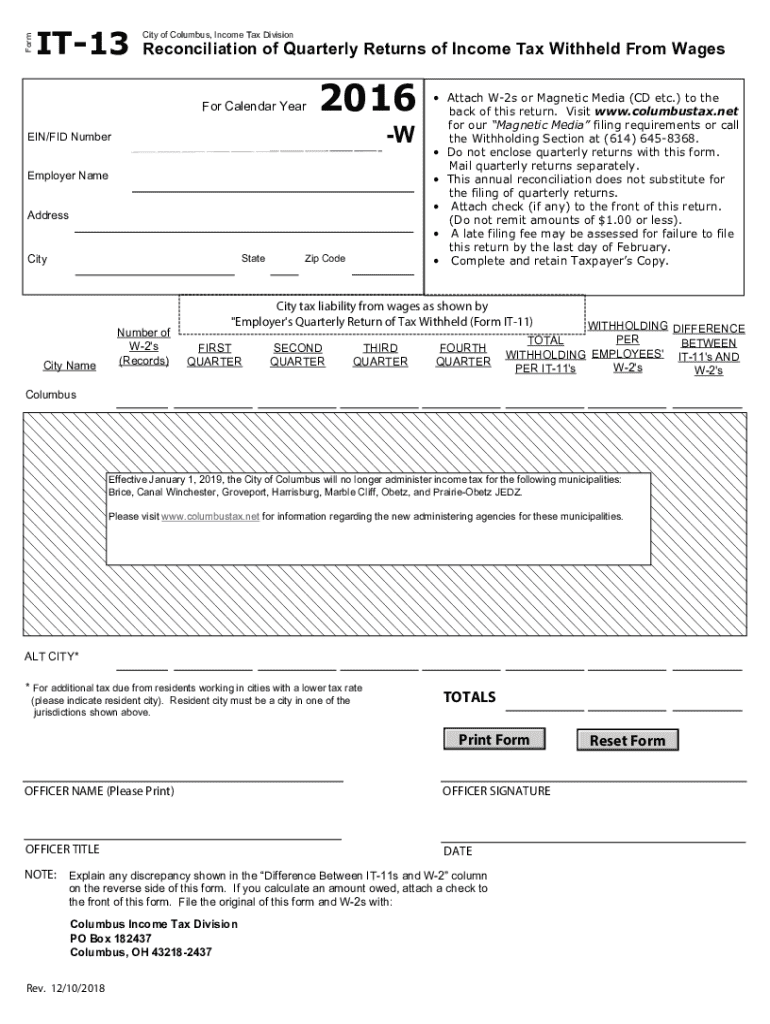 FormIT13City of Columbus, Income Tax DivisionReconciliation of Quarterly Returns of Income Tax Withheld From Wages For Calendar Year2016 WIN/FID Number Employer Name Address CityStateCity Renumber