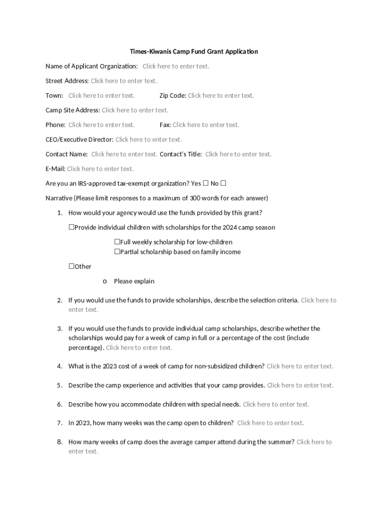 Instructions for the form Times-Kiwanis Camp Fund Grant Application