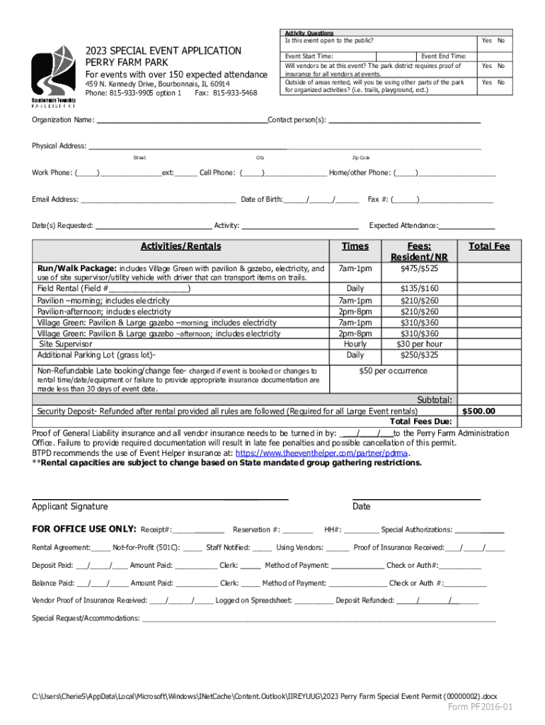 Activity Questions this event open to the public?2023 SPECIAL EVENT APPLICATION PERRY FARM Parker events with over 150 expected attendance 459 N. Kennedy Drive, Bourbons, IL 60914 Phone: 8159339905