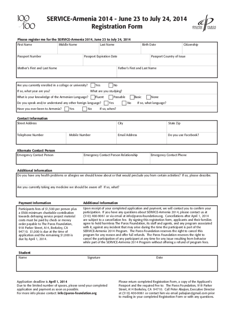 Registration Formulas register me for the SERVICE Armenia 2014, June 23 to July 24, 2014,