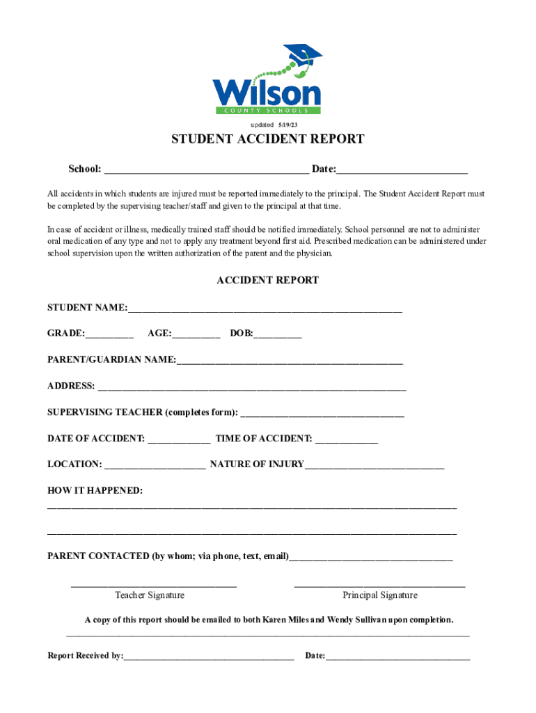 School administrators, teachers, or any staff members who witness or are informed of a student accident are required to file a student accident report.