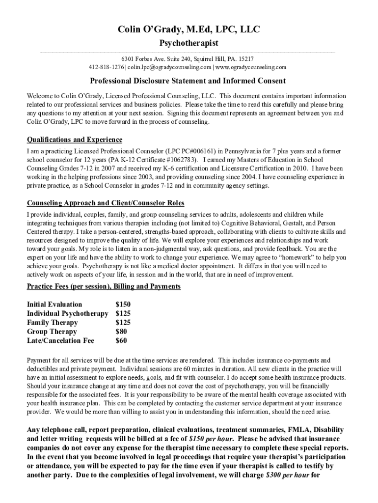 Colin OGrady, M.Ed, LPC, LLC Psychotherapist ___6301 Forbes Ave. Suite 240, Squirrel Hill, PA. 15217 4128181276 | colin.lpc@ogradycounseling.com | www.ogradycounseling.comProfessional Disclosure Statement