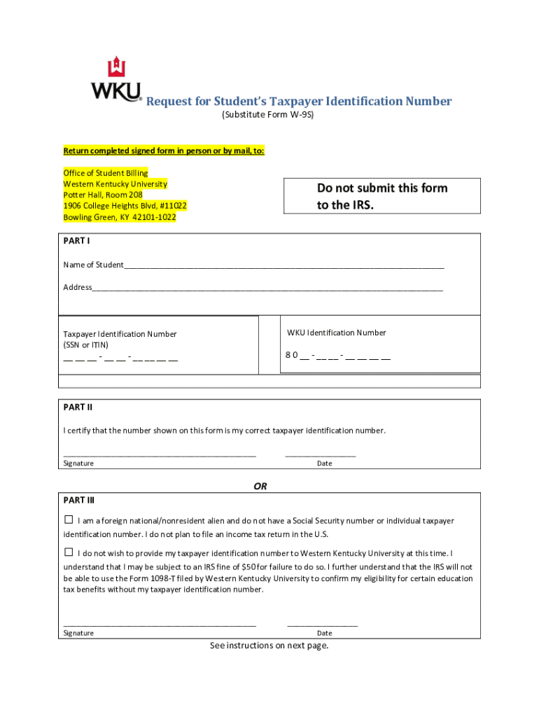 Request for Students Taxpayer Identification Number (Substitute Form W9S)Return completed signed form in person or by mail, to: Office of Student Billing Western Kentucky University Potter Hall, Room