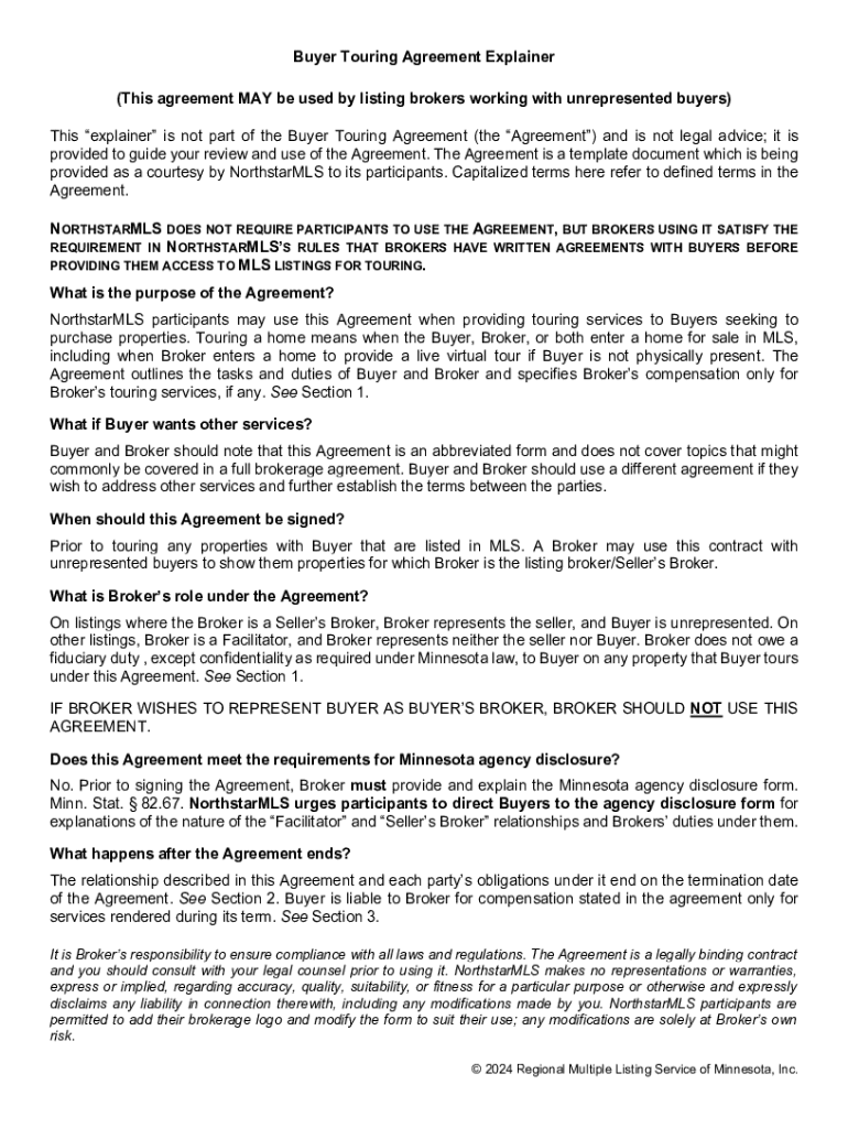 Buyer Touring Agreement Explainer (This agreement MAY be used by listing brokers working with unrepresented buyers) This explainer is not part of the Buyer Touring Agreement (the Agreement) and is