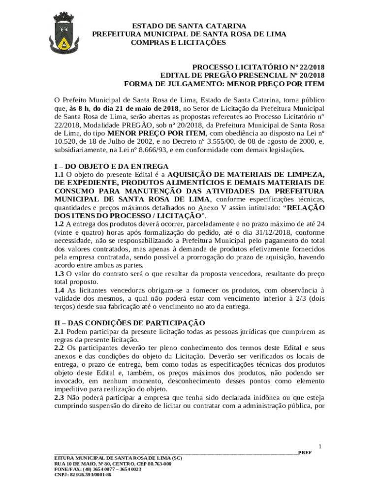 Instructions for the form O Prefeito Municipal de Santa Rosa de Lima, Estado de Santa Catarina, torna pblico que, s 8 h, do dia 21 de maio de 2018, no Setor de Licitao da Prefeitura Municipal de Santa Rosa de Lima, sero abertas as propostas referentes ao Processo Licitatrio n