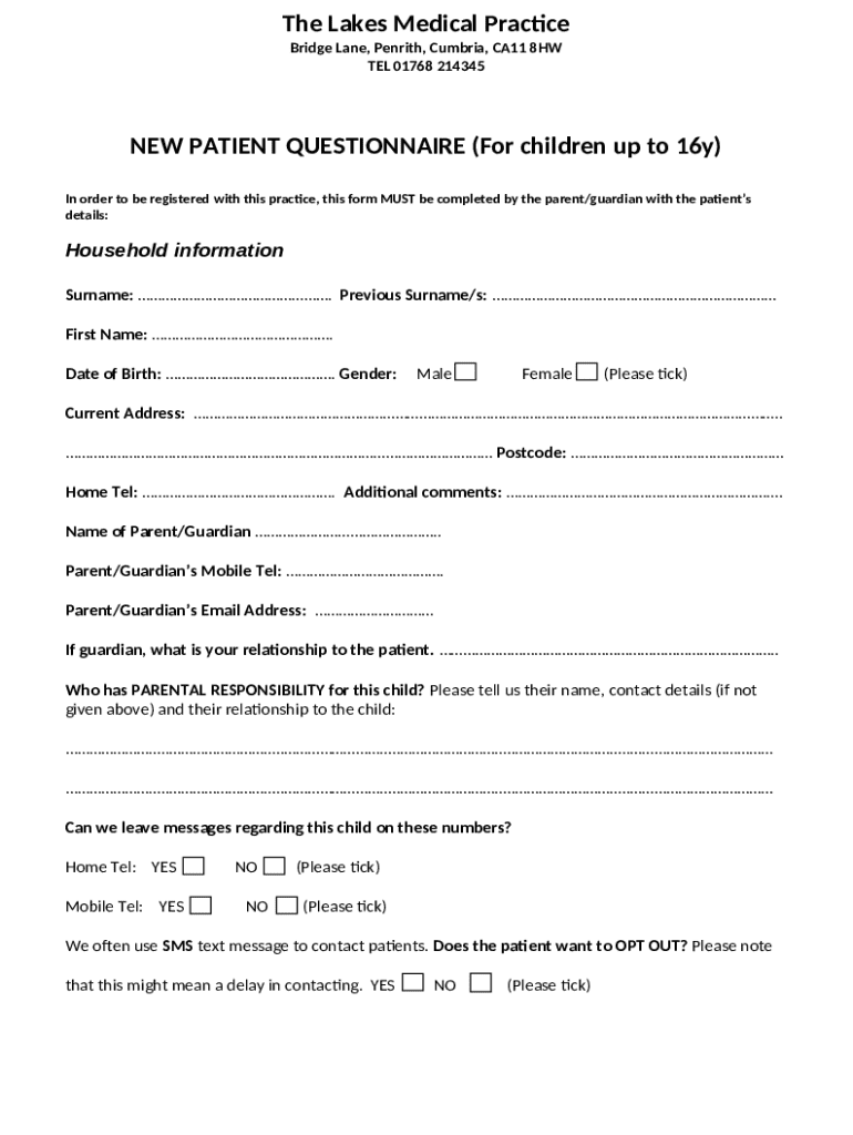 The child new patient health questionnaire is a Word document required to be submitted to the specific address to provide some information. It must be filled-out and signed, which is possible in hard copy, or using a particular solution such as PDFfiller. It lets you fill out any PDF or Word document right in the web, customize it according to your purposes and put a legally-binding e-signature. Right after completion, you can send the child new patient health questionnaire to the relevant receiver, or multiple individuals via email or fax. The blank is printable too because of PDFfiller feature and options proposed for printing out adjustment. In both electronic and in hard copy, your form should have a clean and professional appearance. It's also possible to save it as the template for later, without creating a new file over and over. All that needed is to customize the ready form.