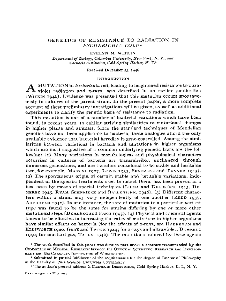 GENETICS OF RESISTANCE TO RADIATION I N ESCHERICHIA COLI\' y2EVELYN M. WITKIN Department o j Zoology, Columbia University, New York, N . Y., and Carnegie Institution, Cold Spring Harbor, N . Y.3 Received