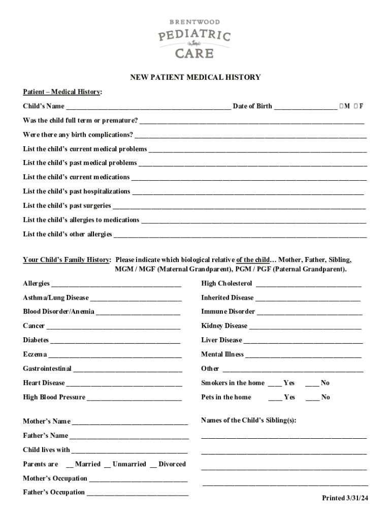 NEW PATIENT MEDICAL HISTORY Patient Medical History: Child's Name ___ Date of Birth ___Was the child full term or premature? ___ Were there any birth complications? ___ List the children current medical