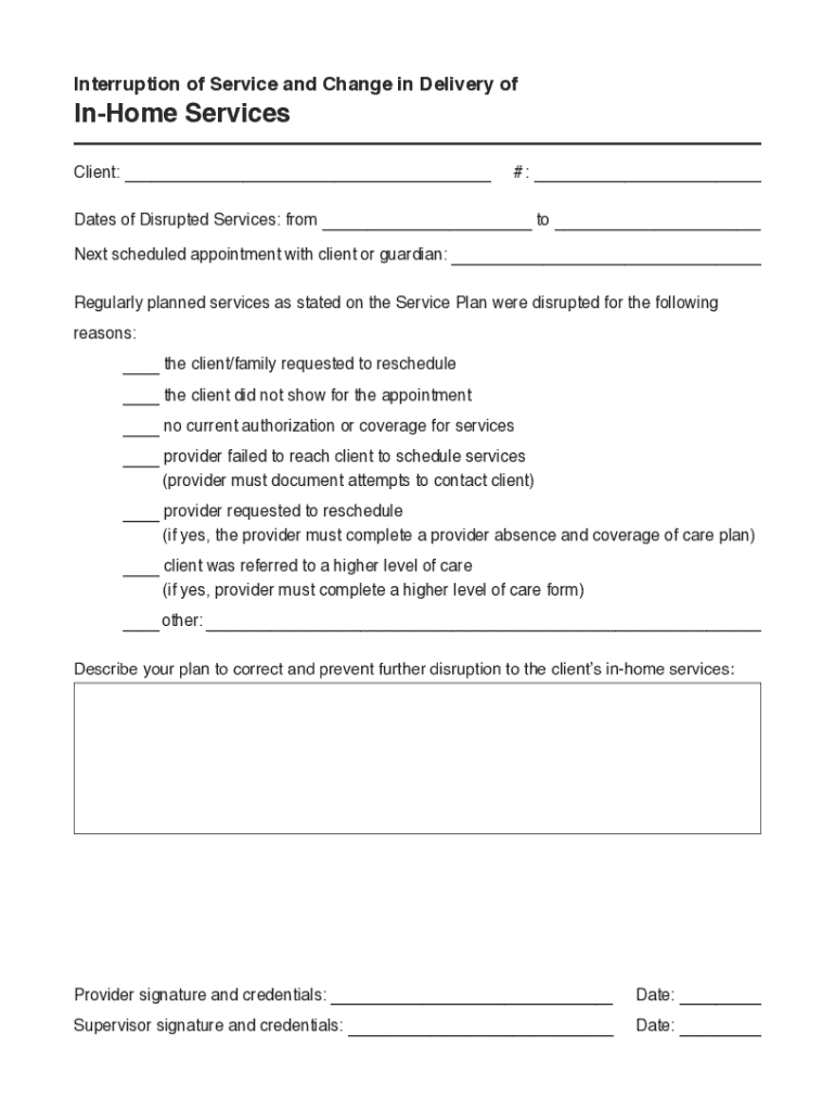 Interruption of Service and Change in Delivery ofInHome ServicesClient: ___#: ___Dates of Disrupted Services: from ___ to ___ Next scheduled appointment with client or guardian: ___ Regularly planned