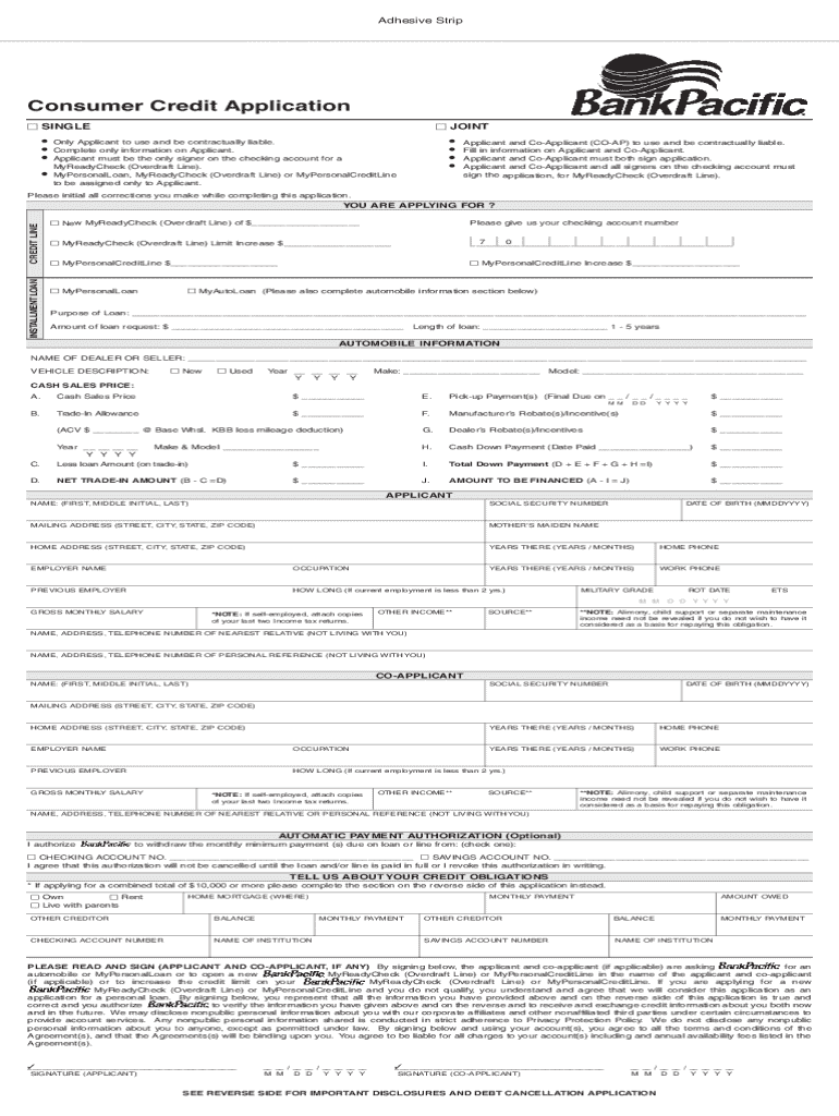 Adhesive StripConsumer Credit Application SINGLE JOINT Only Applicant to use and be contractually liable. Complete only information on Applicant. Applicant must be the only signer on the checking