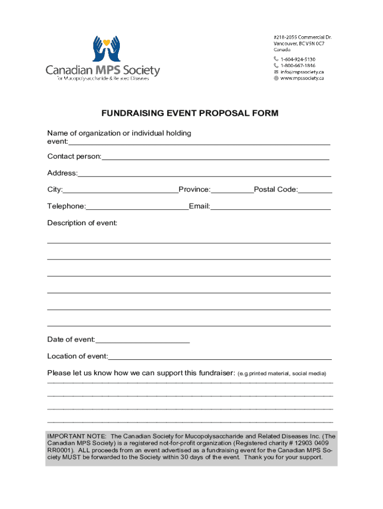 FUNDRAISING EVENT PROPOSAL FORM Name of organization or individual holding event:___ Contact person:___ Address:___ City:___Province:___Postal Code:___ Telephone:___Email:___ Description of event: