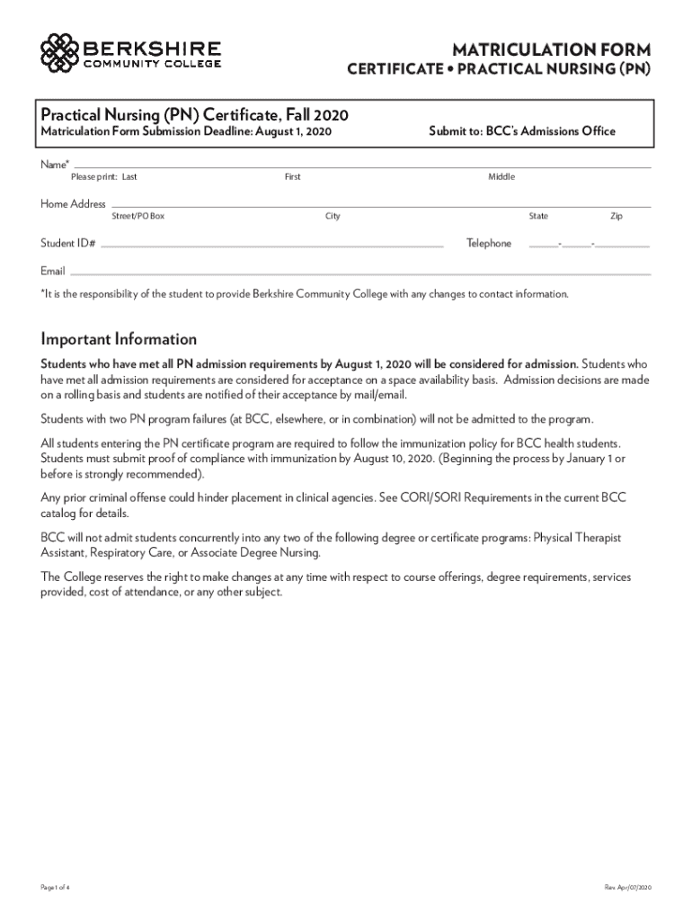 MATRICULATION FORMCERTIFICATE PRACTICAL NURSING (IN)Practical Nursing (IN) Certificate, Fall 2020