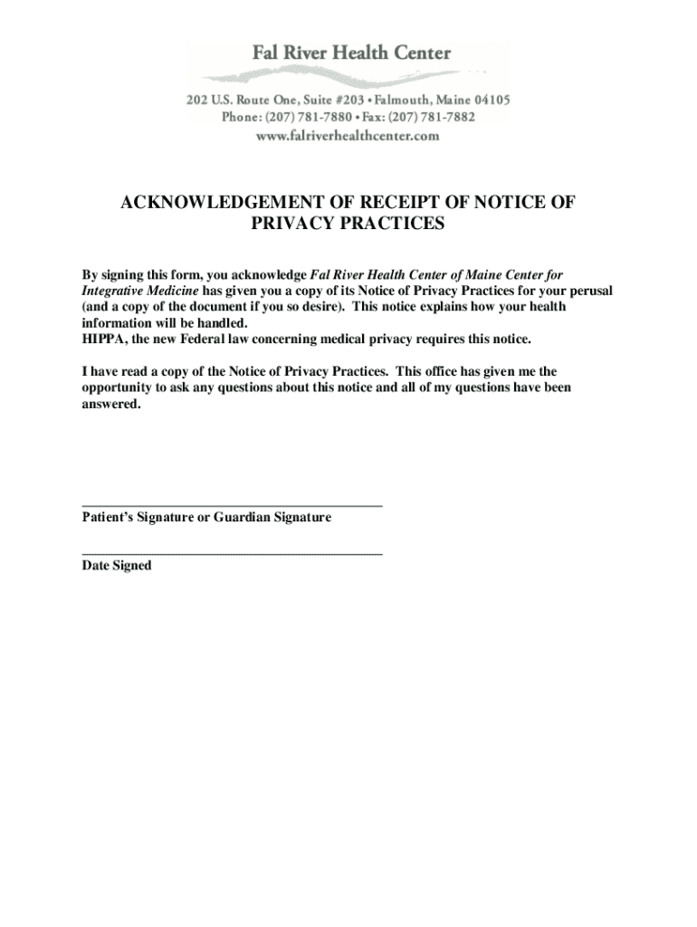 ACKNOWLEDGEMENT OF RECEIPT OF NOTICE OF PRIVACY PRACTICES By signing this form, you acknowledge Fal River Health Center of Maine Center for Integrative Medicine has given you a copy of its Notice