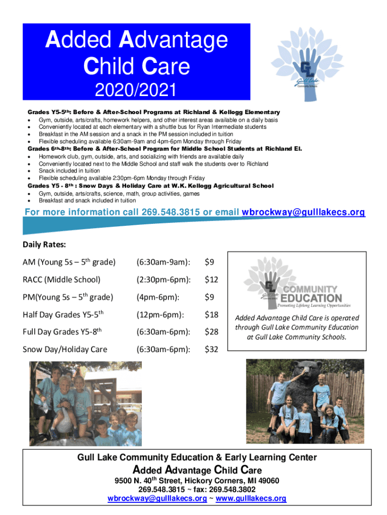 Added Advantage Child Care 2020/2021AGrades Y55th: Before & Interschool Programs at Richland & Kellogg Elementary Gym, outside, arts/crafts, homework helpers, and other interest areas available on