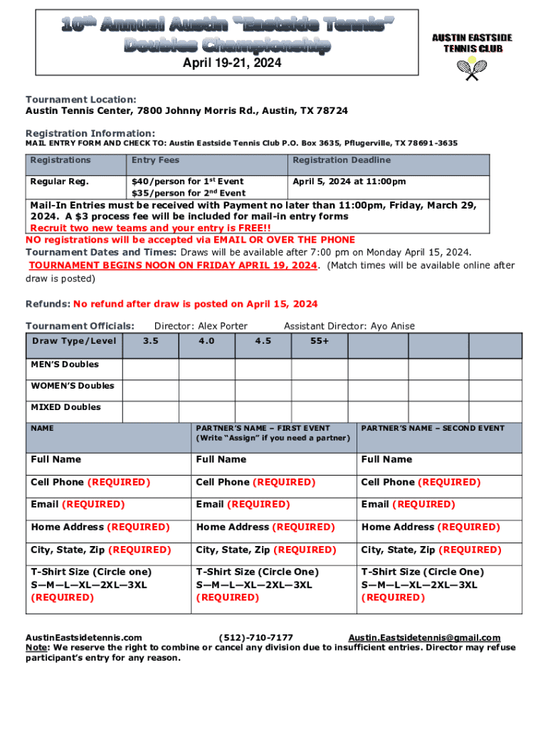 April 1921, 2024 Tournament Location: Austin Tennis Center, 7800 Johnny Morris Rd., Austin, TX 78724 Registration Information: MAIL ENTRY FORM AND CHECK TO: Austin Eastside Tennis Club P.O. Box 3635,