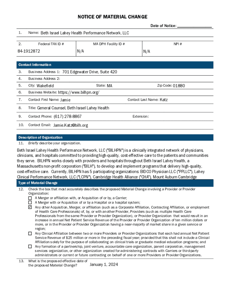 This document outlines the procedure for Providers to submit a Notice of Material Change to the Health Policy Commission, including filing requirements and confidentiality.