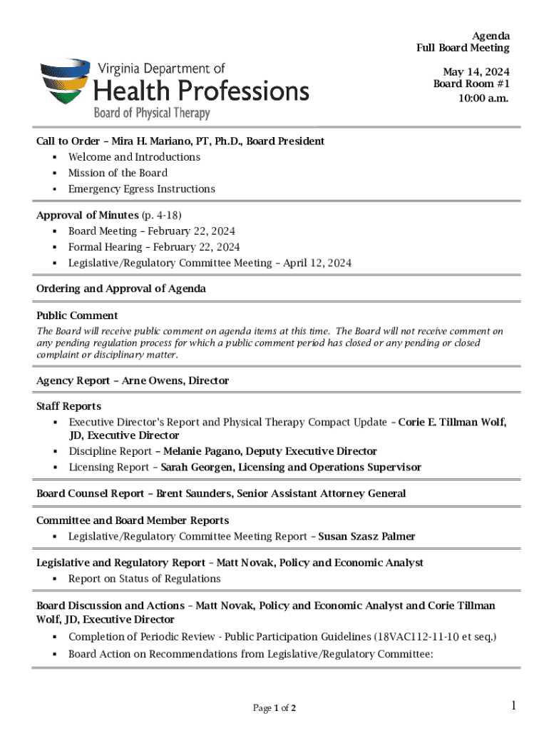 Agenda Full Board Meeting May 14, 2024 Board Room #1 10:00 a.m.Call to Order Mira H. Mariano, PT, Ph.D., Board President Welcome and IntroductionsMission of the BoardEmergency Egress InstructionsApproval