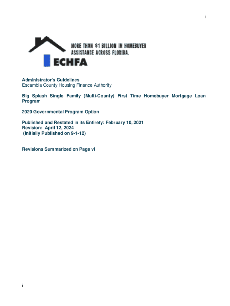 iAdministrators Guidelines Escambia County Housing Finance Authority Big Splash Single Family (MultiCounty) First Time Homebuyer Mortgage Loan Program 2020 Governmental Program Option Published and