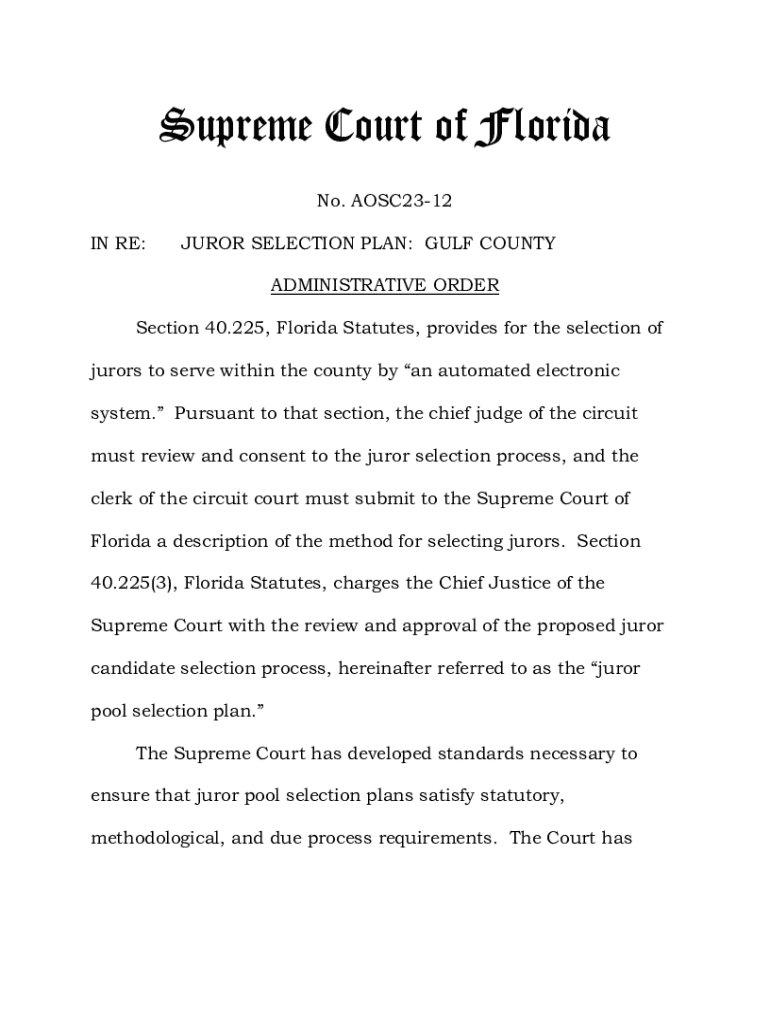 Supreme Court of Florida No. AOSC2312 IN RE:JUROR SELECTION PLAN: GULF COUNTY ADMINISTRATIVE Intersection 40.225, Florida Statutes, provides for the selection of jurors to serve within the county