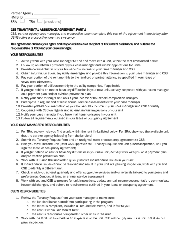 Partner Agency ___ HIS ID ___ SRA ___ ERA ___ (check one) CSS TENANT RENTAL ASSISTANCE AGREEMENT, PART 1 CSS, partner agency case manager, and prospective tenant complete this part of the agreement