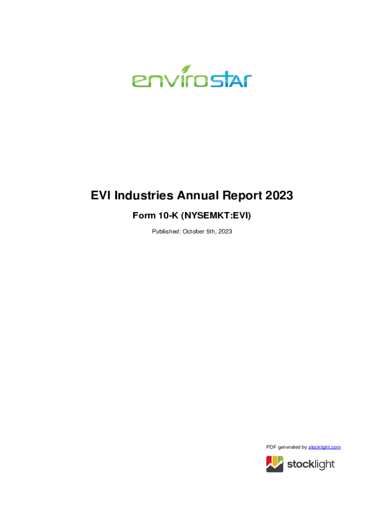 EVI Industries Annual Report 2023 Form 10K (NYSEMKT:EVI) Published: October 5th, 2023PDF generated by stocklight.comUNITED STATES SECURITIES AND EXCHANGE COMMISSION Washington, D.C. 20549 FORM 10K