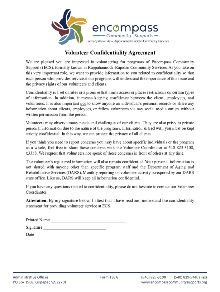 Volunteer Confidentiality Agreement We are pleased you are interested in volunteering for programs of Encompass Community Supports (ECS), formally known as RappahannockRapidan Community Services.