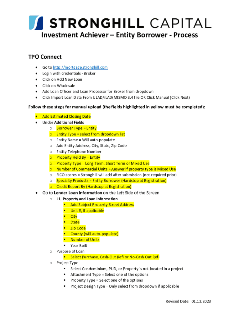 Investment Achiever Entity Borrower Process TPO Connect Go to http://mortgage.stronghill.com Login with credentials Broker Click on Add New Loan Click on Wholesale Add Loan Officer and Loan Processor