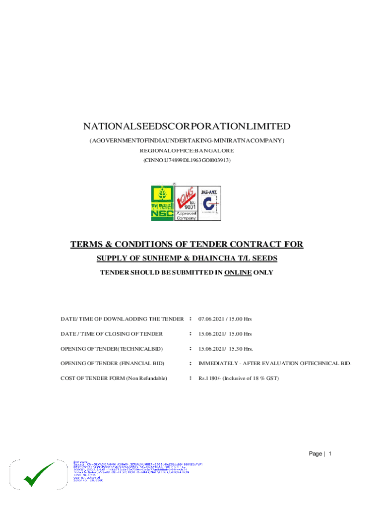 NATIONALSEEDSCORPORATIONLIMITED (AGOVERNMENTOFINDIAUNDERTAKINGMINIRATNACOMPANY) REGIONALOFFICE:BANGALORE (CINNO:U74899DL1963GOI003913)TERMS & CONDITIONS OF TENDER CONTRACT FOR SUPPLY OF SUNHEMP &